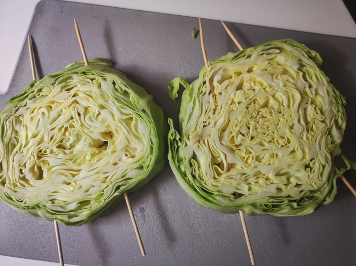 Kapustę pokrój na plastry i zabezpiecz patyczkami do szaszłyków.