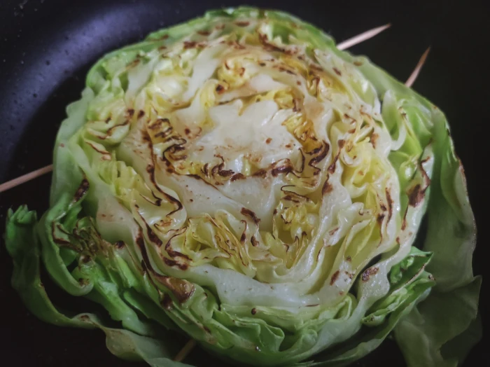Rozgrzej olej na patelni, połóż "stek" z kapusty i posyp szczyptą soli. Smaż na średnio-dużym ogniu, około 5 minut z każdej strony, aż się zarumieni.