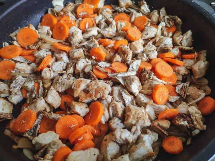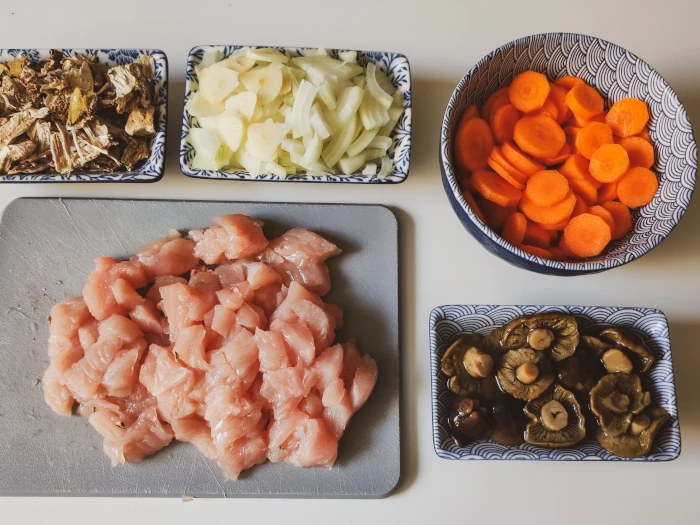 Indyka pokrój w dość drobną kostkę, marchewkę w plasterki, cebulę w cienkie półpiórka. Ząbki czosnku obierz i pokrój w plasterki. Suszone grzyby połam w rękach na drobne kawałki.