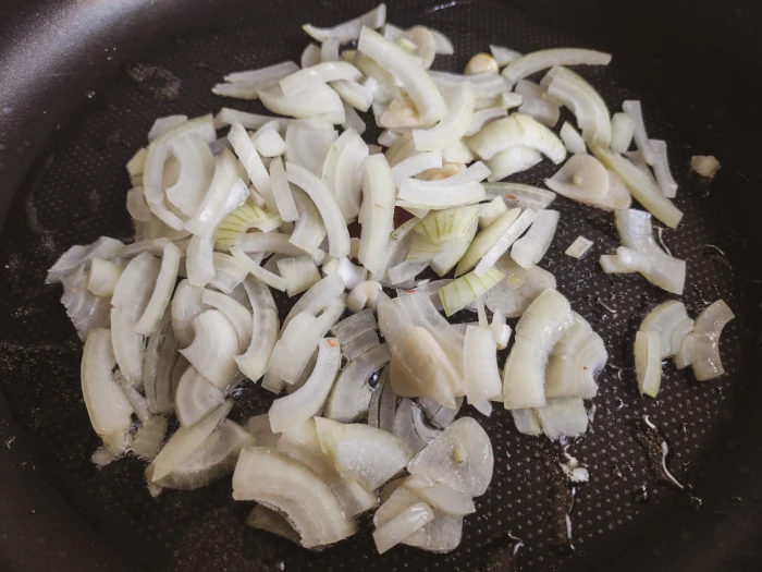 Na patelni podgrzej olej do smażenia. Na dość dużym ogniu podsmaż cebulę z czosnkiem do zeszklenia, aby ich aromat przeszedł do tłuszczu.