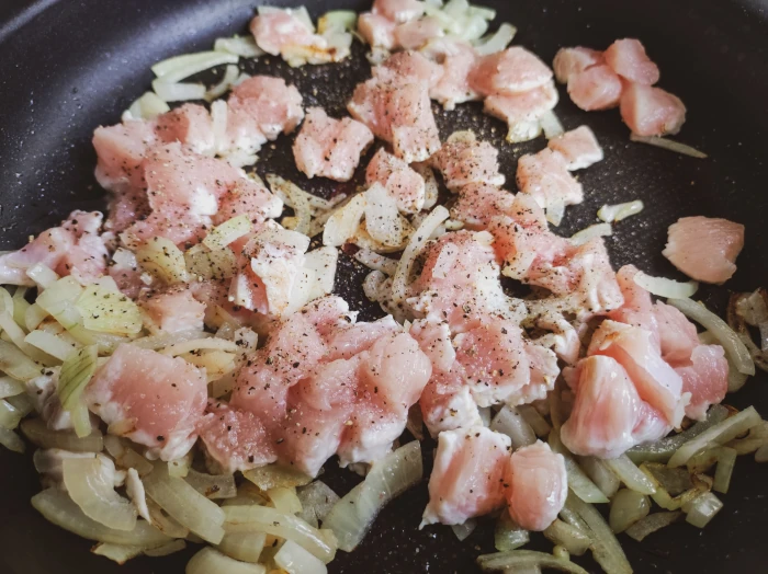 Na patelnię dodaj mięso, posól je i dodaj pieprz "do smaku". Nadal na dość dużym ogniu podsmaż indyka, aż się zarumieni.